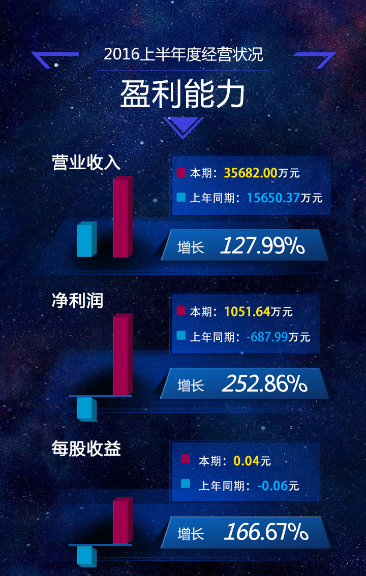 2016上半年度,开元官方站网页版营业收入为35682.00万元,同比上年同期增长127.99%;归属于公司股东的净利润为1051.64万元,同比上年同期增长252.86%;基本每股收益为0.04元,同比上年同期增长166.67%。