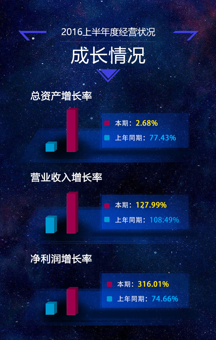 2016上半年度,开元官方站网页版总资产增长率为2.68%,营业收入增长率为127.99%,净利润增长率为316.01%。